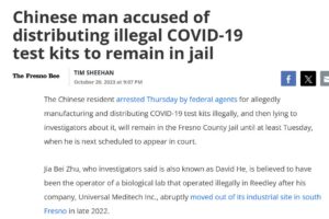 EN INGLÉS Hombre chino acusado de distribuir kits ilegales de pruebas de COVID-19 permanecerá en prisión Posted on octubre 21, 2023 por coronado https://www.aol.com/news/chinese-man-accused-distributing-illegal-000738924.html