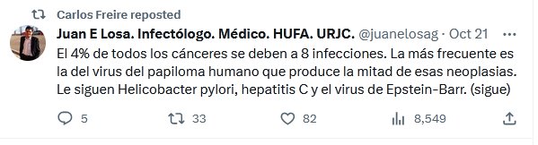 DEFENDERSE DE LOS VIRUS ES DEFENDERSE DEL CÁNCER El 4% de todos los cánceres se deben a 8 infecciones ¿O 9 AHORA CON COVID? Posted on octubre 22, 2023 por coronado https://twitter.com/juanelosag/status/1715757715778113819