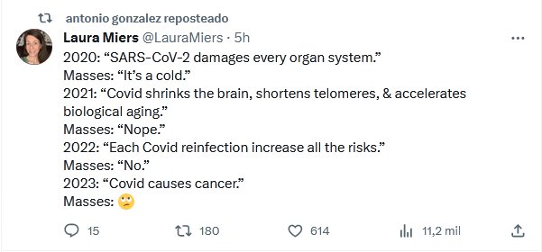 EN INGLÉS 2020: “El SARS-CoV-2 daña todos los sistemas de órganos”. Masas: “Es un resfriado”. 2021: “Covid encoge el cerebro, acorta los telómeros y acelera el envejecimiento biológico”. Masas (O MEDIOS?): «No». 2022: “Cada reinfección por Covid aumentan todos los riesgos”. Masas (O MEDIOS?): “No”. 2023: “Covid causa cáncer”. Masas (O MEDIOS?): 🙄
