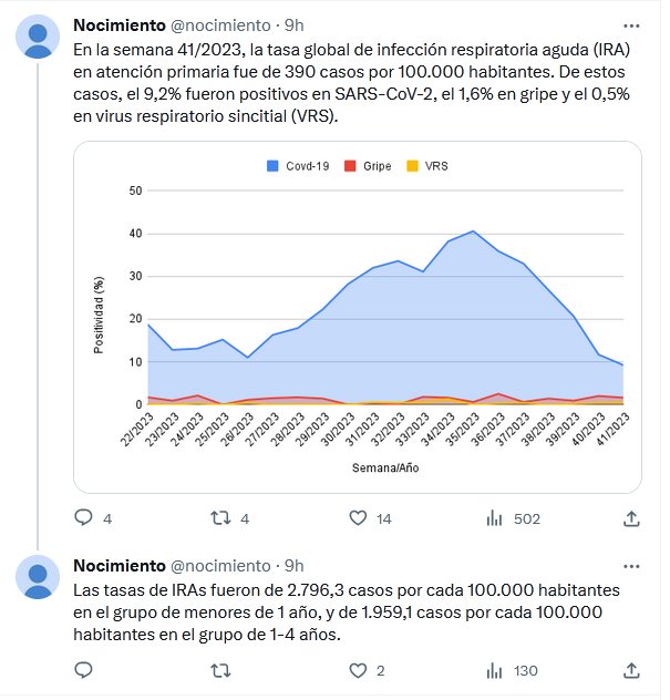 En la semana 41/2023, la tasa global de infección respiratoria aguda (IRA) en atención primaria fue de 390 casos por 100.000 habitantes. De estos casos, el 9,2% fueron positivos en SARS-CoV-2, el 1,6% en gripe y el 0,5% en virus respiratorio sincitial (VRS)
