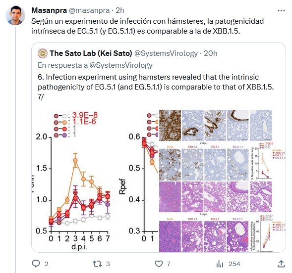 Según un experimento de infección con hámsteres, la patogenicidad intrínseca de EG.5.1 (y EG.5.1.1) es comparable a la de XBB.1.5. Posted on octubre 23, 2023 por coronado