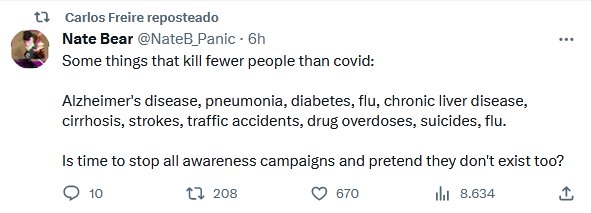 EN INGLÉS Algunas cosas que matan a menos personas que el covid: Enfermedad de Alzheimer, neumonía, diabetes, gripe, enfermedad hepática crónica, cirrosis, ictus, accidentes de tráfico, sobredosis de drogas, suicidios, gripe (Y LA GRIPE Y SOBRE TODO, TAMBIÉN)