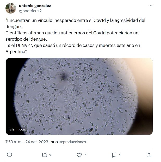 «Encuentran un vínculo inesperado entre Covid y la agresividad del dengue. Científicos afirman que los anticuerpos del Cov1d potenciarían un serotipo del dengue. Es el SEROTIPO DENV-2, que causó un récord de casos y muertes este año en Argentina»