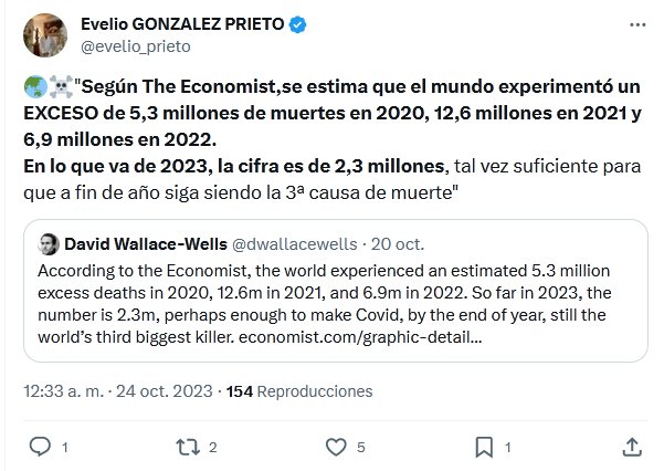 «ES LEVE», MENTÍAN 🌏☠️»Según The Economist,se estima que el mundo experimentó un EXCESO de 5,3 millones de muertes en 2020, 12,6 millones en 2021 y 6,9 millones en 2022. En lo que va de 2023, la cifra es de 2,3 millones, tal vez suficiente para que a fin de año siga siendo la 3ª causa de muerte»