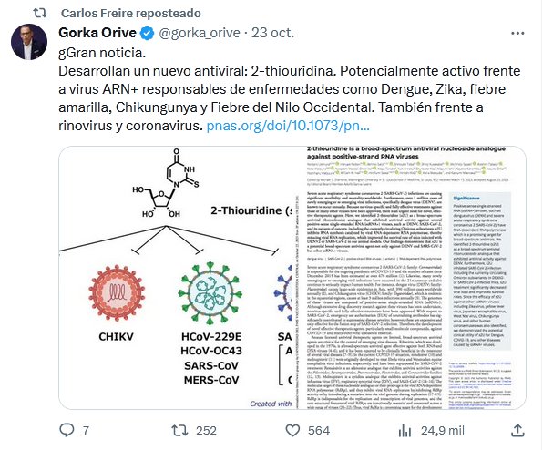 Gran noticia. Desarrollan un nuevo antiviral: 2-thiouridina. Potencialmente activo frente a virus ARN+ responsables de enfermedades como Dengue, Zika, fiebre amarilla, Chikungunya y Fiebre del Nilo Occidental. También frente a rinovirus y coronavirus