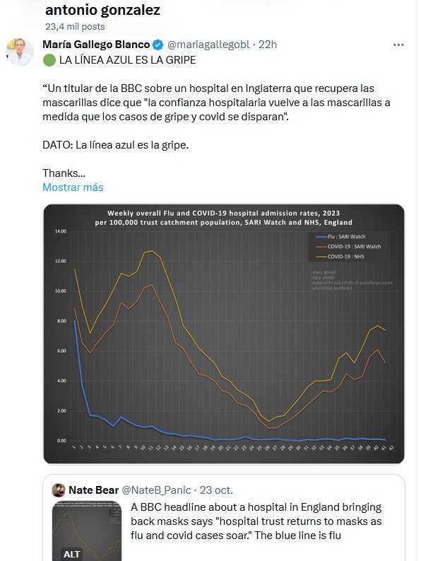 MENTIRA DESCUBIERTA DE FORMA MUY GRÁFICA “Un titular de la BBC sobre un hospital en Inglaterra que recupera las mascarillas dice que «la confianza hospitalaria vuelve a las mascarillas a medida que los casos de gripe y covid se disparan». DATO: La línea azul es la gripe.