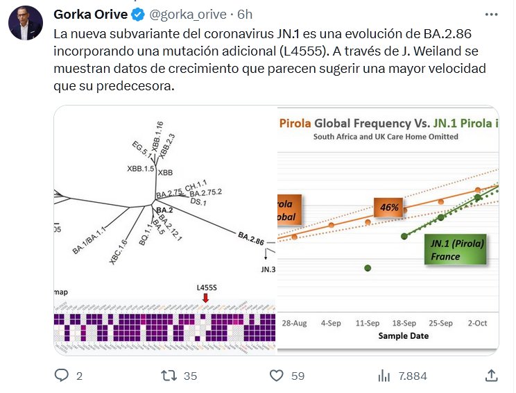 ESTAMOS A UNA NUEVA VARIANTE DE UNA NUEVA PANDEMIA La nueva subvariante del coronavirus JN.1 es una evolución de BA.2.86 incorporando una mutación adicional (L4555). A través de J. Weiland se muestran datos de crecimiento que parecen sugerir una mayor velocidad que su predecesora.