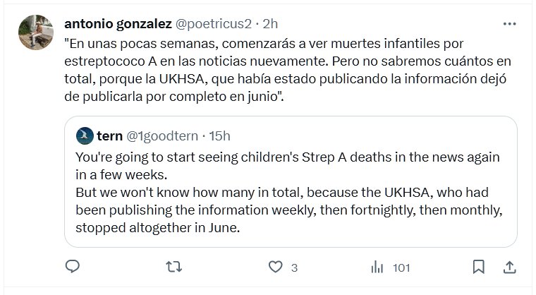 NOCOVID, POSTCOVID Y NOTINFORMO HACEN ESTRAGOS «En unas pocas semanas, comenzarás a ver muertes infantiles por estreptococo A en las noticias nuevamente. Pero no sabremos cuántos en total, porque la UKHSA, que había estado publicando la información dejó de publicarla por completo en junio».