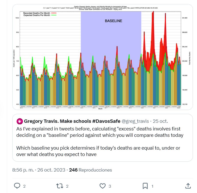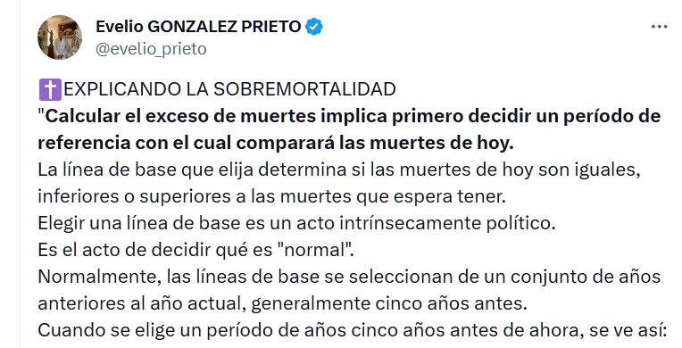 ✝️EXPLICANDO LA SOBREMORTALIDAD «Calcular el exceso de muertes implica primero decidir un período de referencia con el cual comparará las muertes de hoy. La línea de base que elija determina si las muertes de hoy son iguales, inferiores o superiores a las muertes que espera tener. Elegir una línea de base es un acto intrínsecamente político. Es el acto de decidir qué es «normal».