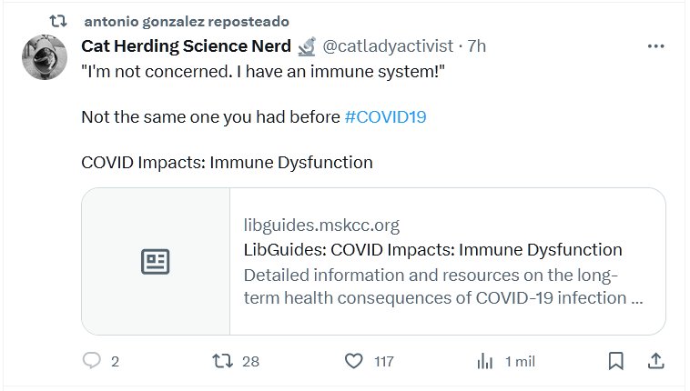 CUIDADO COVIDIOTAS! (EN INGLÉS) «No me preocupa. ¡Tengo un sistema inmunológico!» No es el mismo que tenías antes del #COVID19 Impactos de COVID: disfunción inmune Posted on octubre 27, 2023 por coronado https://libguides.mskcc.org/CovidImpacts/Immune