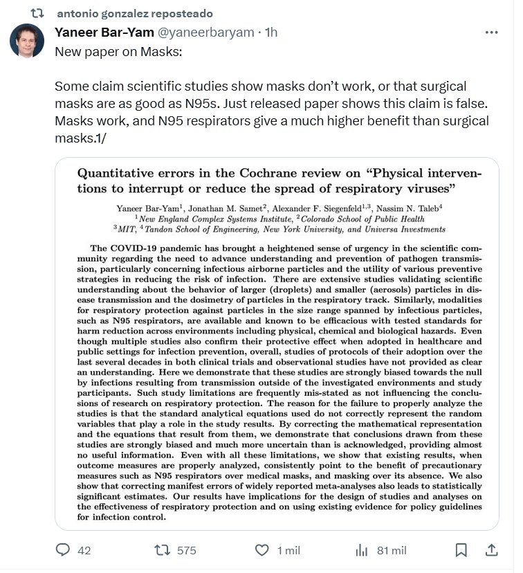 EN INGLÉS Nuevo artículo sobre Máscaras: Algunos afirman que los estudios científicos muestran que las mascarillas no funcionan o que las mascarillas quirúrgicas son tan buenas como las N95. Un documento recién publicado muestra que esta afirmación es falsa. Las mascarillas funcionan y los respiradores N95 ofrecen un beneficio mucho mayor que las mascarillas quirúrgicas