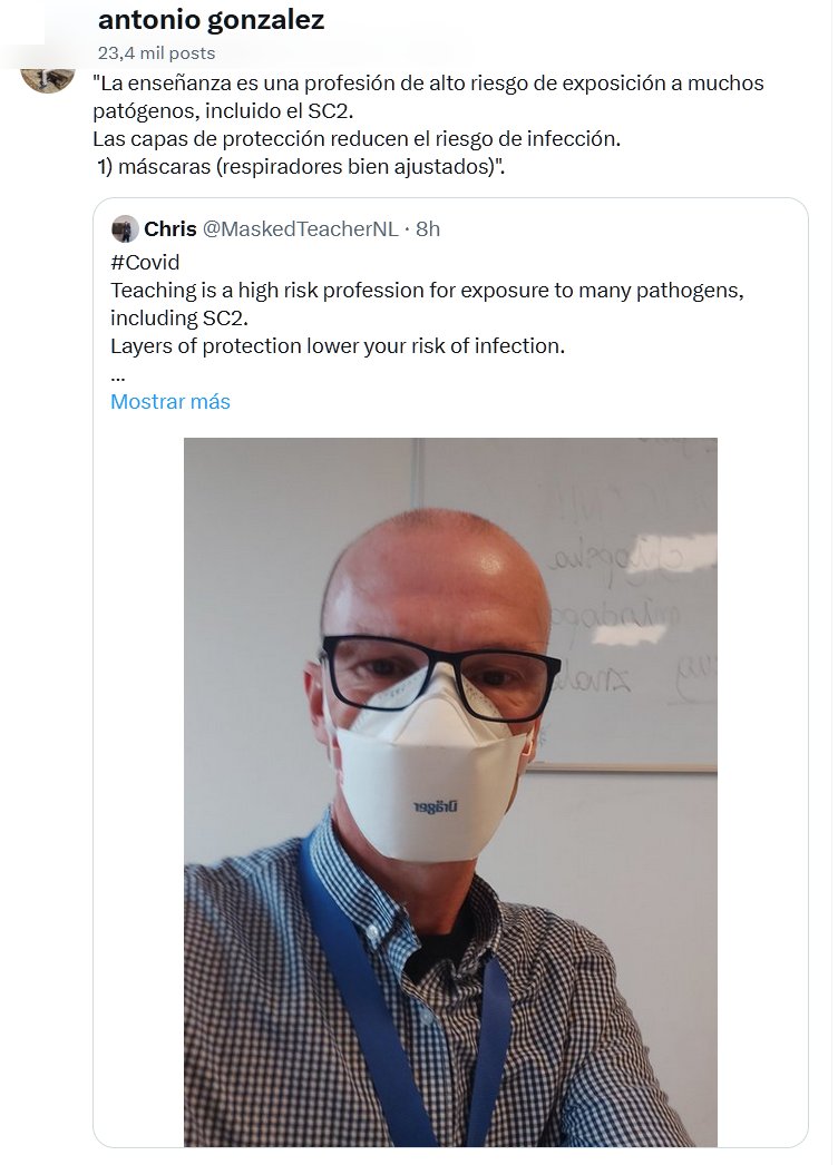 LA ENSEÑANZA DEL MAESTRO «La enseñanza es una profesión de alto riesgo de exposición a muchos patógenos, incluido el SC2. Las capas de protección reducen el riesgo de infección. 1) máscaras (respiradores (BARBIJOS, MASCARILLAS, TAPABOCAS) bien ajustados)».