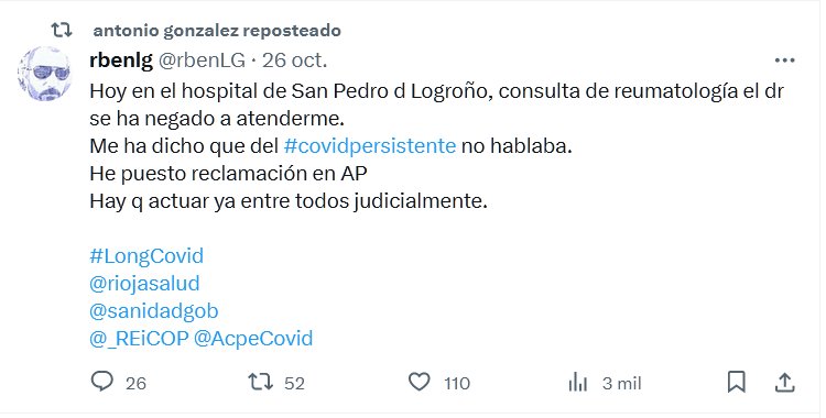 TESTIMONIOS Hoy en el hospital de San Pedro d Logroño, consulta de reumatología el dr se ha negado a atenderme. Me ha dicho que del #covidpersistente no hablaba. He puesto reclamación en AP Hay q actuar ya entre todos judicialmente