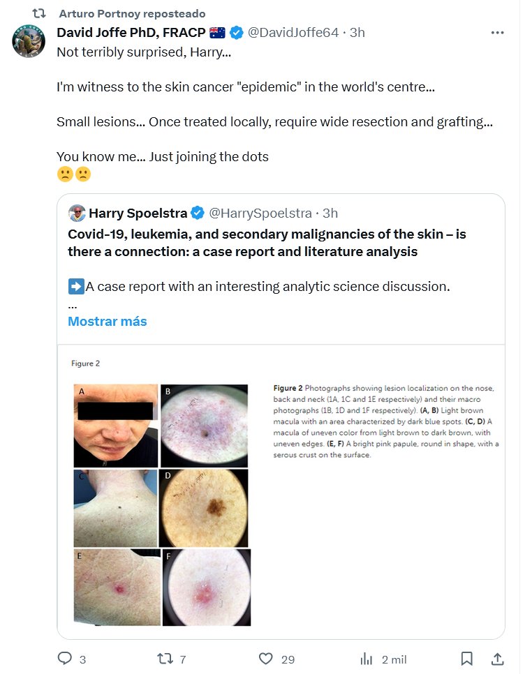 Covid-19, leucemia y neoplasias malignas secundarias de la piel: ¿existe una conexión? Reporte de un caso y análisis de la literatura Posted on octubre 29, 2023 por coronado https://twitter.com/HarrySpoelstra/status/1718570944640192760 - https://www.frontiersin.org/journals/oncology/articles/10.3389/fonc.2023.1265479/full