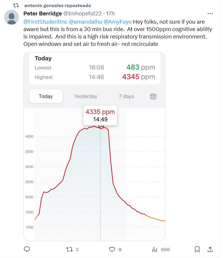 AIRE VICIADO (EN INGLÉS) Hola amigos, no estoy seguro si lo saben, pero esto es a 30 minutos en autobús. A más de 1500 ppm, la capacidad cognitiva se ve afectada. Y este es un entorno de transmisión respiratoria de alto riesgo. Abra las ventanas y ponga aire fresco, no recircule