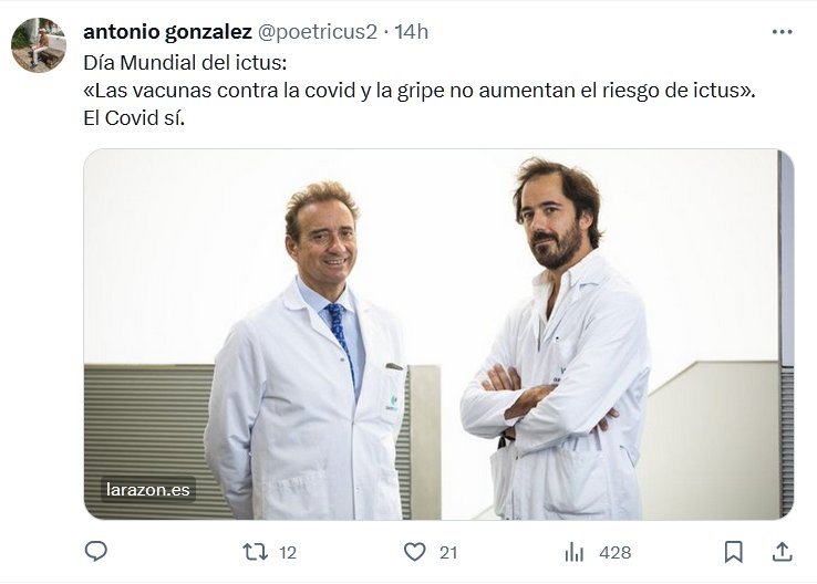 Día Mundial del ictus: «Las vacunas contra la covid y la gripe no aumentan el riesgo de ictus». El Covid sí. Posted on octubre 30, 2023 por coronado https://www.larazon.es/salud/dia-mundial-vacunas-covid-gripe-aumentan-riesgo-ictus_20231029653b4dbfe8e7a5000159e93c.html