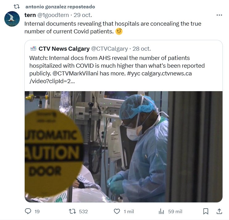 EN INGLÉS Documentos internos que revelan que los hospitales están ocultando el número real de pacientes actuales de Covid. 🤨 Posted on octubre 30, 2023 por coronado https://calgary.ctvnews.ca/video?clipId=2795877&playlistId=null&binId=1.1201914&playlistPageNum=1