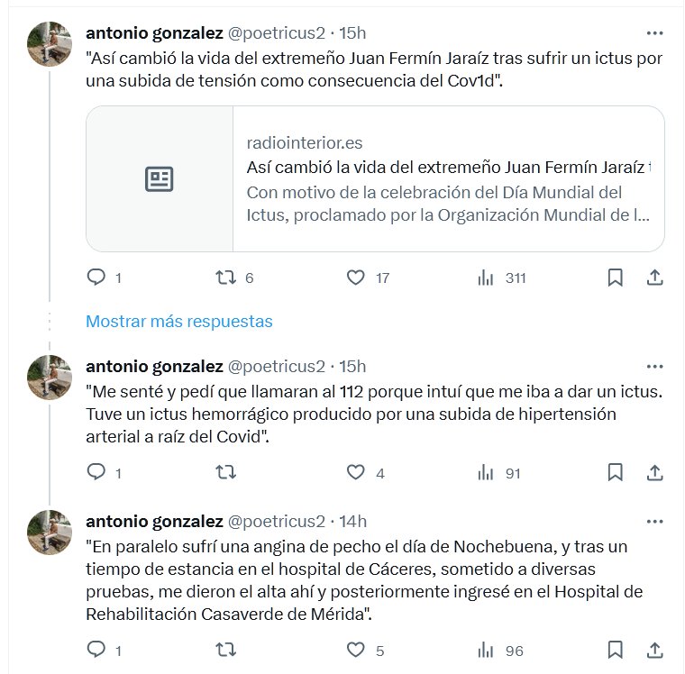 MENTÍAN, NO ERA LEVE «Así cambió la vida del extremeño Juan Fermín Jaraíz tras sufrir un ictus por una subida de tensión como consecuencia del Covid» Posted on octubre 30, 2023 por coronado https://www.radiointerior.es/2023/10/29/asi-cambio-la-vida-del-extremeno-juan-fermin-jaraiz-tras-sufrir-un-ictus-por-una-subida-de-tension/