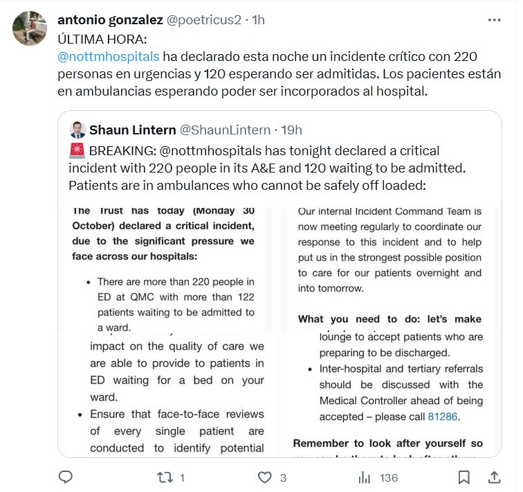 ÚLTIMA HORA: @nottmhospitals (Nottingham Hospitals) ha declarado esta noche un incidente crítico con 220 personas en urgencias y 120 esperando ser admitidas. Los pacientes están en ambulancias esperando poder ser incorporados al hospital.
