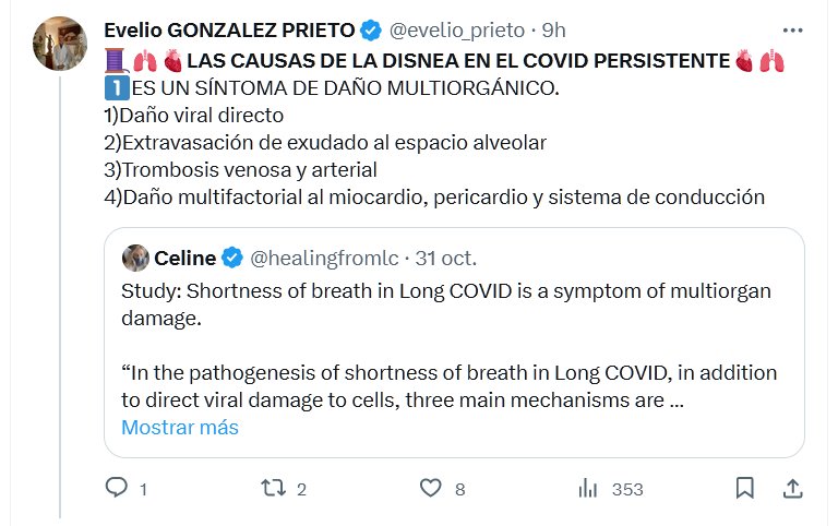 NO ES LEVE 🫁🫀LAS CAUSAS DE LA DISNEA EN EL COVID PERSISTENTE🫀🫁 1⃣ES UN SÍNTOMA DE DAÑO MULTIORGÁNICO. 1)Daño viral directo 2)Extravasación de exudado al espacio alveolar 3)Trombosis venosa y arterial 4)Daño multifactorial al miocardio, pericardio y sistema de conducción