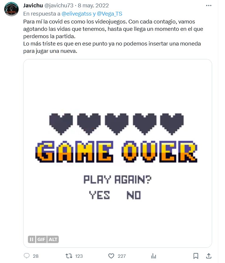 GAME OVER Para mí la covid es como los videojuegos. Con cada contagio, vamos agotando las vidas que tenemos, hasta que llega un momento en el que perdemos la partida. Lo más triste es que en ese punto ya no podemos insertar una moneda para jugar una nueva.