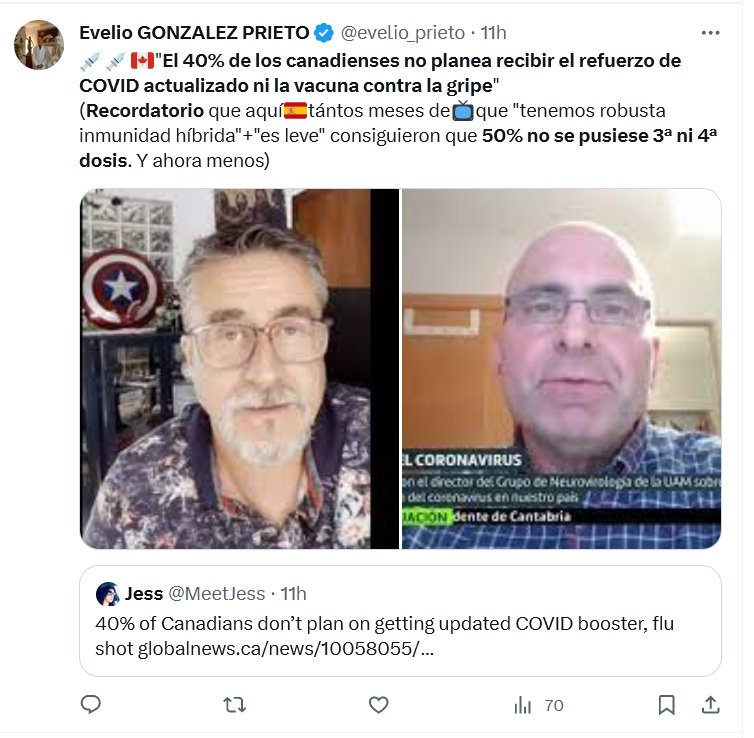 💉💉🇨🇦»El 40% de los canadienses no planea recibir el refuerzo de COVID actualizado ni la vacuna contra la gripe» (Recordatorio que aquí🇪🇸tántos meses de📺que «tenemos robusta inmunidad híbrida»+»es leve» consiguieron que 50% no se pusiese 3ª ni 4ª dosis. Y ahora menos)