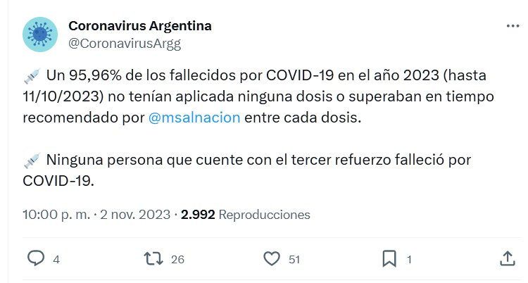 ARGENTINOS ¡VACÚNENSE! Coronavirus Argentina @CoronavirusArgg 💉 Un 95,96% de los fallecidos por COVID-19 en el año 2023 (hasta 11/10/2023) no tenían aplicada ninguna dosis o superaban en tiempo recomendado por @msalnacion entre cada dosis. 💉 Ninguna persona que cuente con el tercer refuerzo falleció por COVID-19.