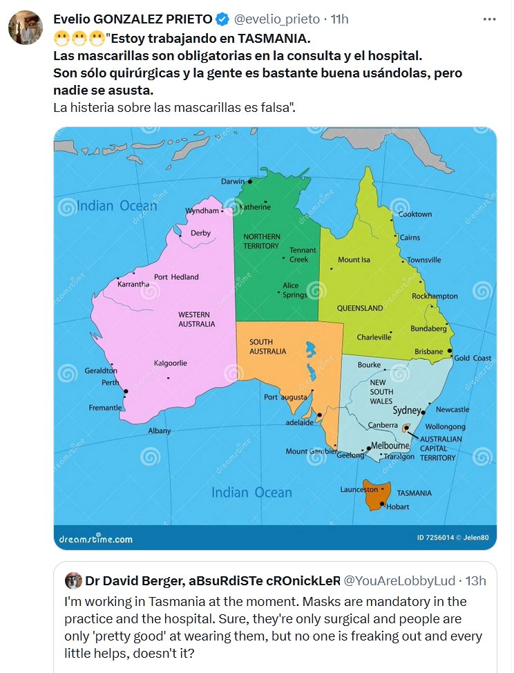 Dr David Berger 😷😷😷»Estoy trabajando en TASMANIA. Las mascarillas son obligatorias en la consulta y el hospital. Son sólo quirúrgicas y la gente es bastante buena usándolas, pero nadie se asusta. La histeria sobre las mascarillas es falsa».