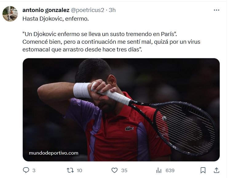 POR FIN SE DIO? Hasta Djokovic, enfermo. «Un Djokovic enfermo se lleva un susto tremendo en París». Comencé bien, pero a continuación me sentí mal, quizá por un virus estomacal que arrastro desde hace tres días».