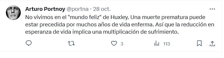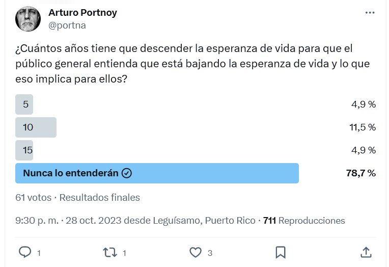 Arturo Portnoy @portna ¿Cuántos años tiene que descender la esperanza de vida para que el público general entienda que está bajando la esperanza de vida y lo que eso implica para ellos? Posted on noviembre 4, 2023 por coronado