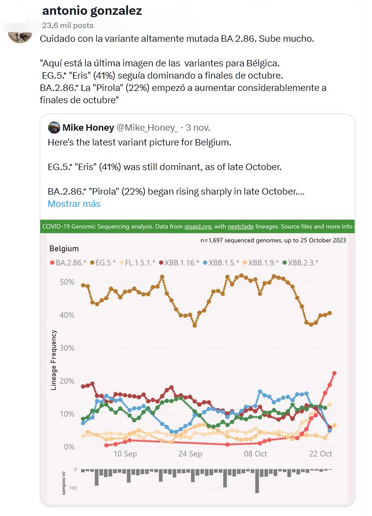 Cuidado con la variante altamente mutada BA 2.86. Sube mucho. «Aquí está la última imagen de las variantes para Bélgica. EG.5.* «Eris» (41%) seguía dominando a finales de octubre. BA.2.86.* La «Pirola» (22%) empezó a aumentar considerablemente a finales de octubre»