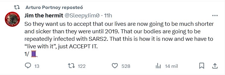 EN INGLÉS Por eso quieren que aceptemos que nuestras vidas ahora serán mucho más cortas y más enfermas que hasta 2019. Que nuestros cuerpos se infectarán repetidamente con SARS2. Que así es ahora y tenemos que “vivir con ello”, simplemente ACEPTARLO.