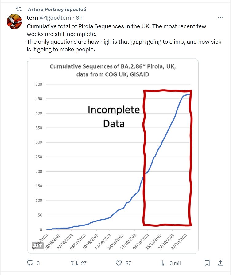 EN INGLÉS Total acumulado de secuencias Pirola en el Reino Unido. Las últimas semanas aún están incompletas. Las únicas preguntas son qué tan alto va a subir ese gráfico y qué tan enferma va a enfermar a la gente.