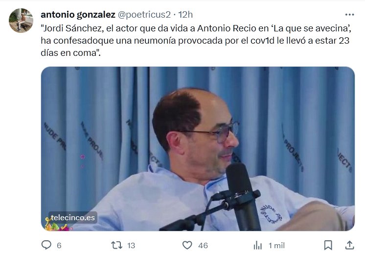 MIENTEN, NO ES LEVE «Jordi Sánchez, el actor que da vida a Antonio Recio en ‘La que se avecina’, ha confesado que una neumonía provocada por el covid le llevó a estar 23 días en coma» Posted on noviembre 5, 2023 por coronado https://www.telecinco.es/fiesta/20231104/jordi-sanchez-coma-neumonia-covid_18_010889499.html