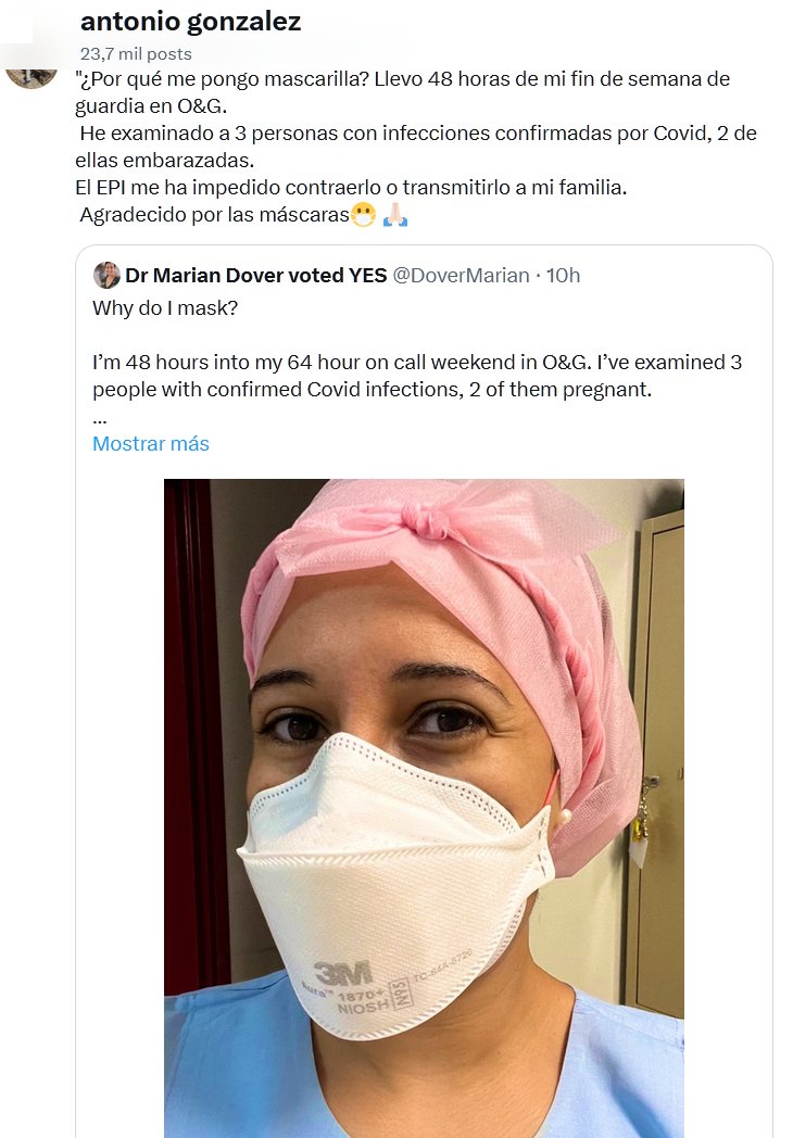 TESTIMONIOS «¿Por qué me pongo mascarilla? Llevo 48 horas de mi fin de semana de guardia en O&G. He examinado a 3 personas con infecciones confirmadas por Covid, 2 de ellas embarazadas. El EPI me ha impedido contraerlo o transmitirlo a mi familia. Agradecido por las máscaras😷 🙏🏻