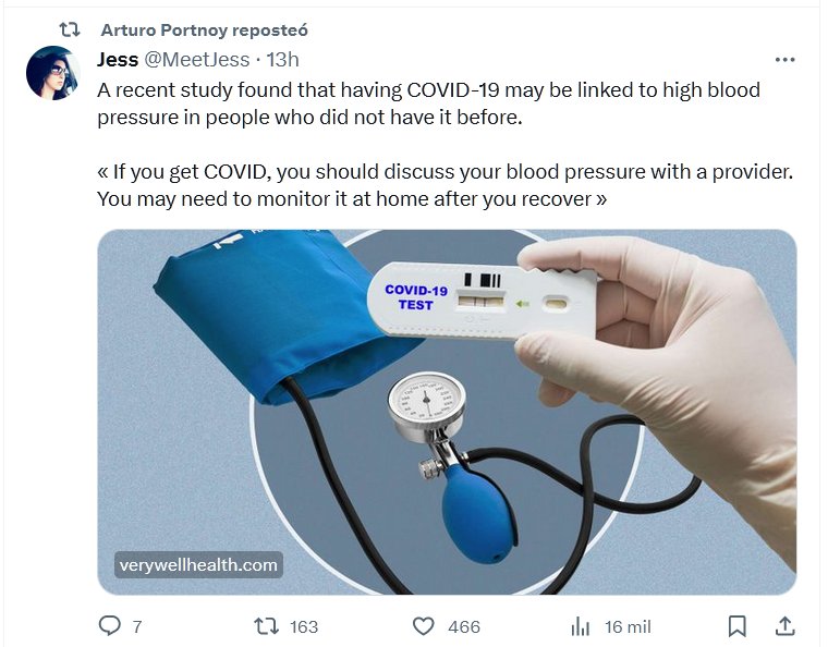 Un estudio reciente encontró que tener COVID-19 puede estar relacionado con la presión arterial alta en personas que no la tenían antes. « Si contrae COVID, debe hablar sobre su presión arterial con un MÉDICO. Es posible que tengas que controlarlo en casa después de que te recuperes »