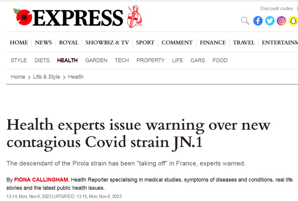 EN INGLÉS Expertos en salud advierten sobre la nueva cepa contagiosa de Covid JN.1 Posted on noviembre 6, 2023 por coronado https://www.express.co.uk/life-style/health/1832031/covid-new-strain-jn-1