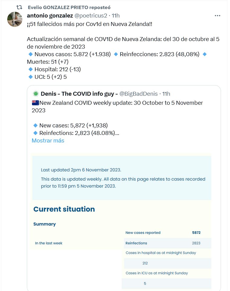 FIN DE PANDEMIA? SÍ, PARA LOS QUE MUEREN! ¡¡51 fallecidos más por Cov1d en Nueva Zelanda!! Posted on noviembre 6, 2023 por coronado https://twitter.com/BigBadDenis/status/1721334546287972505