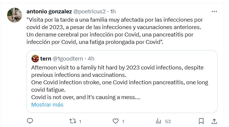 NO ES LEVE, NO TE DEJES ENGAÑAR «Visita por la tarde a una familia muy afectada por las infecciones por covid de 2023, a pesar de las infecciones y vacunaciones anteriores. Un derrame cerebral por infección por Covid, una pancreatitis por infección por Covid, una fatiga prolongada por Covid».
