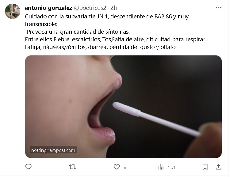 Cuidado con la subvariante JN.1, descendiente de BA2.86 y muy transmisible: Provoca una gran cantidad de síntomas. Entre ellos Fiebre, escalofríos, Tos,Falta de aire, dificultad para respirar, Fatiga, náuseas,vómitos, diarrea, pérdida del gusto y olfato.