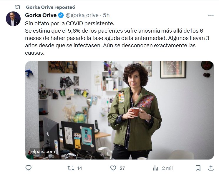 Sin olfato por la COVID persistente. Se estima que el 5,6% de los pacientes sufre anosmia más allá de los 6 meses de haber pasado la fase aguda de la enfermedad. Algunos llevan 3 años desde que se infectasen. Aún se desconocen exactamente las causas.