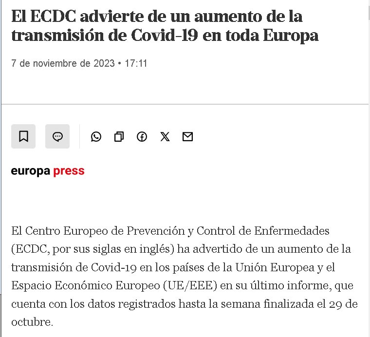FIN DE PANDEMIA? El ECDC advierte de un aumento de la transmisión de Covid-19 en toda Europa | 7 de noviembre de 2023 Posted on noviembre 8, 2023 por coronado https://www.lanacion.com.ar/agencias/el-ecdc-advierte-de-un-aumento-de-la-transmision-de-covid-19-en-toda-europa-nid07112023/