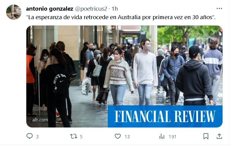 PREGUNTA COVIDIOTA: A QUÉ SE DEBERÁ? «La esperanza de vida retrocede en Australia por primera vez en 30 años» Posted on noviembre 8, 2023 por coronado https://www.afr.com/policy/health-and-education/life-expectancy-goes-backwards-for-first-time-in-30-years-20231108-p5eii8