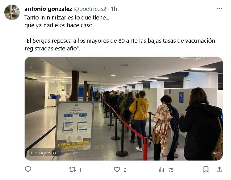 SE COSECHA LO QUE SE SIEMBRA Tanto minimizar es lo que tiene… que ya nadie os hace caso. «El Sergas repesca a los mayores de 80 ante las bajas tasas de vacunación registradas este año». Posted on noviembre 8, 2023 por coronado