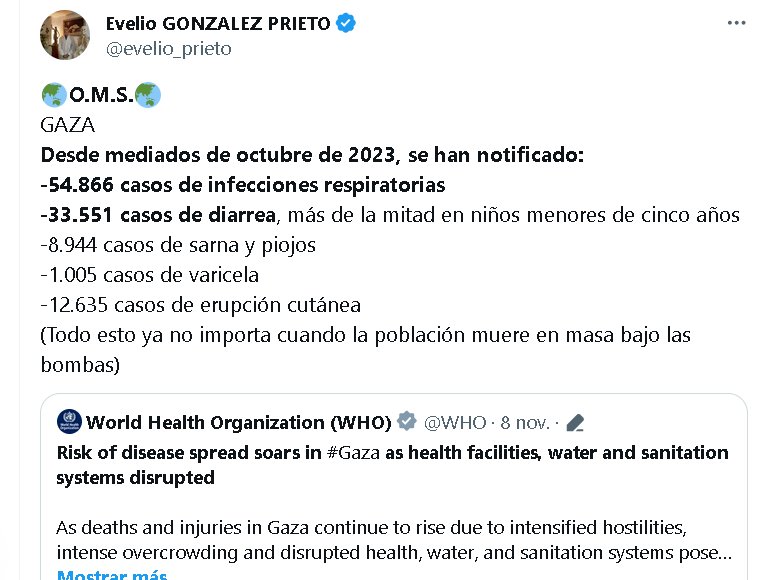 LESA HUMANIDAD 🌏O.M.S.🌏 GAZA Desde mediados de octubre de 2023, se han notificado: -54.866 casos de infecciones respiratorias -33.551 casos de diarrea, más de la mitad en niños menores de cinco años -8.944 casos de sarna y piojos -1.005 casos de varicela -12.635 casos de erupción cutánea (Todo esto ya no importa cuando la población muere en masa bajo las bombas)