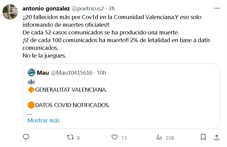 LA PANDEMIA NO TERMINÓ, NO ES LEVE, NO ES UNA GRIPE, NO, NO, NO ¡¡20 fallecidos más por Covid en la Comunidad Valenciana.Y eso solo informando de muertes oficiales!! De cada 52 casos comunicados se ha producido una muerte. ¡!2 de cada 100 comunicados ha muerto!! 2% de letalidad en base a datos comunicados. No te la juegues.