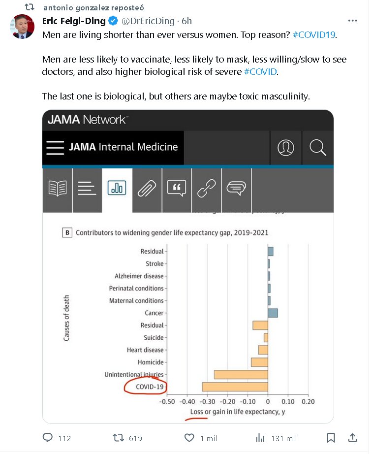 Los hombres tienen menos probabilidades de vacunarse, menos probabilidades de usar mascarillas, menos disposición o lentitud para consultar al médico y también un mayor riesgo biológico de sufrir #COVID grave. Este último es biológico, pero otros tal vez sean masculinidades tóxicas.