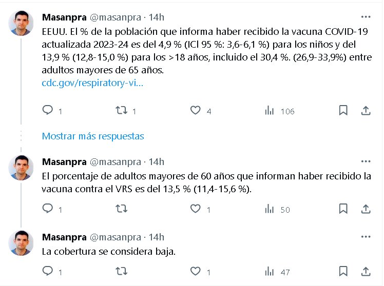 BAJA COBERTURA EEUU. El % de la población que informa haber recibido la vacuna COVID-19 actualizada 2023-24 es del 4,9 % (ICl 95 %: 3,6-6,1 %) para los niños y del 13,9 % (12,8-15,0 %) para los >18 años, incluido el 30,4 %. (26,9-33,9%) entre adultos mayores de 65 años.
