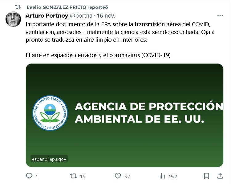 Importante documento de la EPA sobre la transmisión aérea del COVID, ventilación, aerosoles. Posted on noviembre 17, 2023 por coronado https://espanol.epa.gov/cai/el-aire-en-espacios-cerrados-y-el-coronavirus-covid-19
