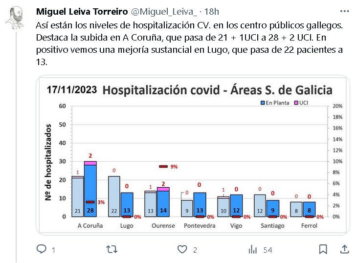 Así están los niveles de hospitalización CV. en los centro públicos gallegos. Destaca la subida en A Coruña, que pasa de 21 + 1UCI a 28 + 2 UCI Posted on noviembre 18, 2023 por coronado